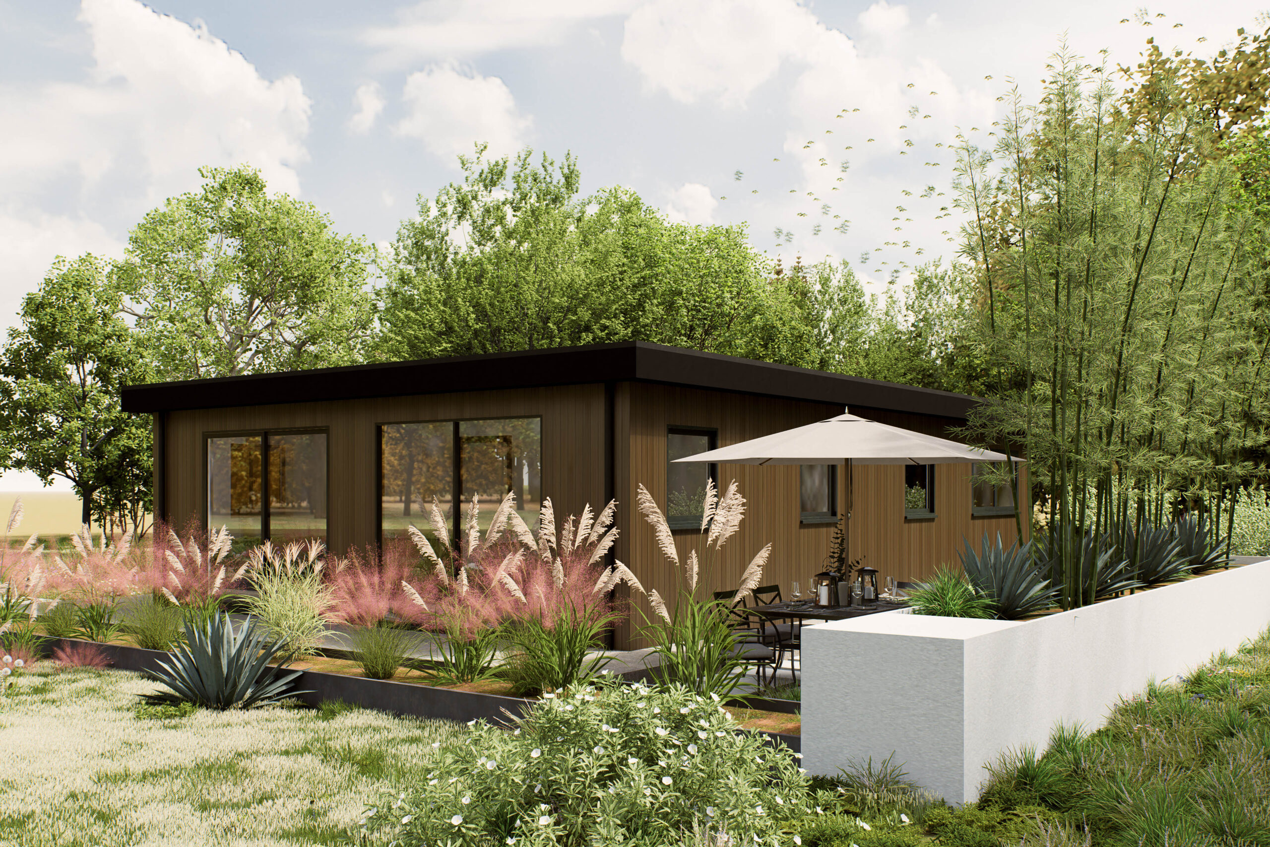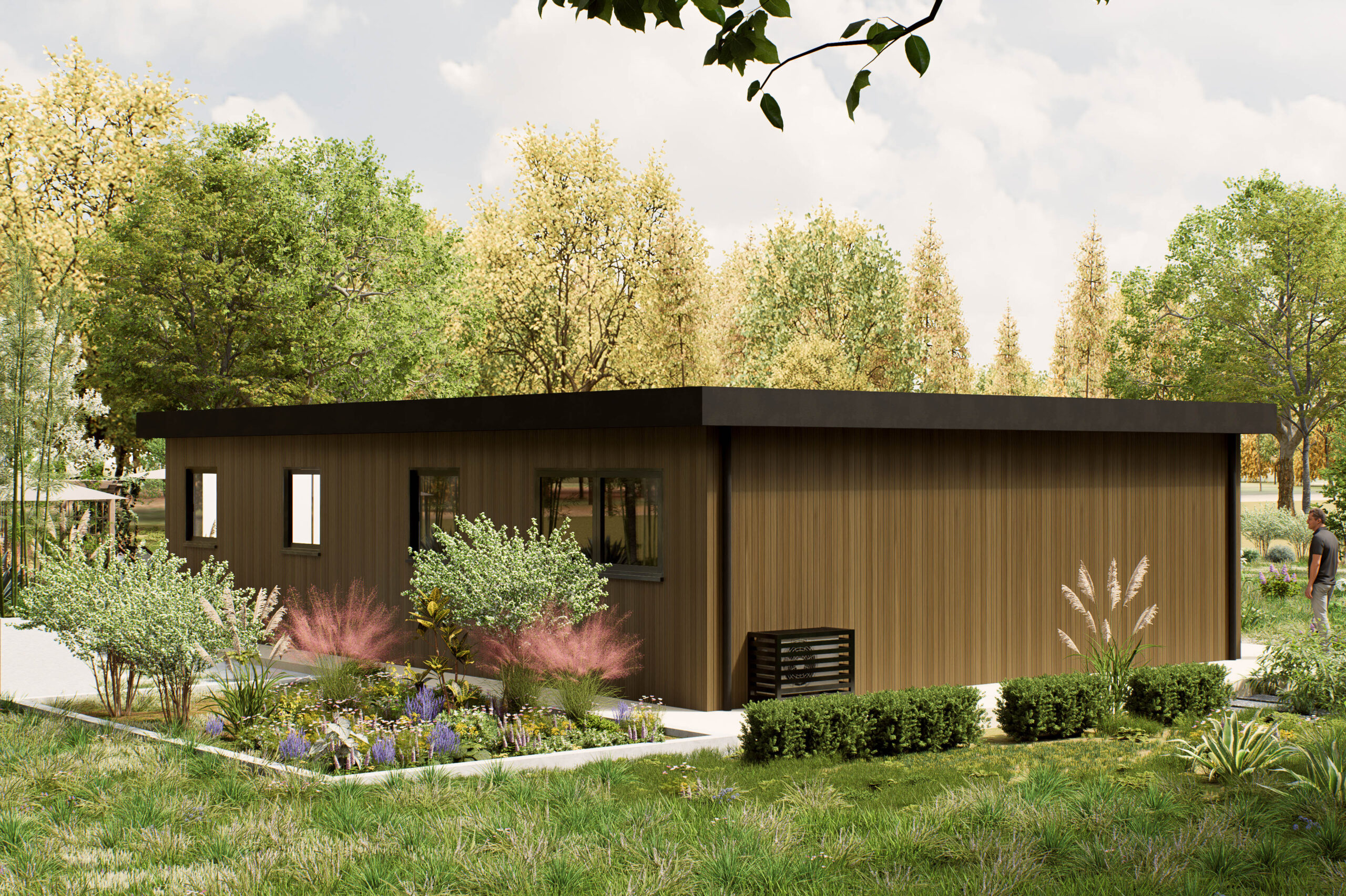 De Arluna is een eigentijdse woning van 100 m², ontworpen voor wie rust, ruimte en verbondenheid met de natuur belangrijk vindt. Het platte dak en de verticale houten gevel geven het model een moderne en warme uitstraling, terwijl de grote ramen zorgen voor veel daglicht en een open sfeer. De woning ligt volledig gelijkvloers en is praktisch ingedeeld. Binnen biedt de Arluna twee slaapkamers, een royale woonkamer met open keuken, een los toilet, een berging en een veranda aan de voorzijde. De leefruimte is ruim en overzichtelijk, met directe toegang tot het terras en de tuin. De veranda vormt een fijne overgang tussen binnen en buiten, perfect voor ontspanning of sociale momenten. De berging zorgt voor extra opbergruimte, zodat de woning netjes en functioneel blijft. De Arluna is geschikt voor diverse woonvormen: van zelfstandig wonen tot mantelzorg of werken aan huis. Dankzij de heldere plattegrond en het rustige ontwerp is dit model eenvoudig aan te passen aan persoonlijke voorkeuren, zoals vaste kastruimte, zonwering of extra voorzieningen. Een woning die rust en stijl combineert met praktische flexibiliteit — klaar voor nu én de toekomst.