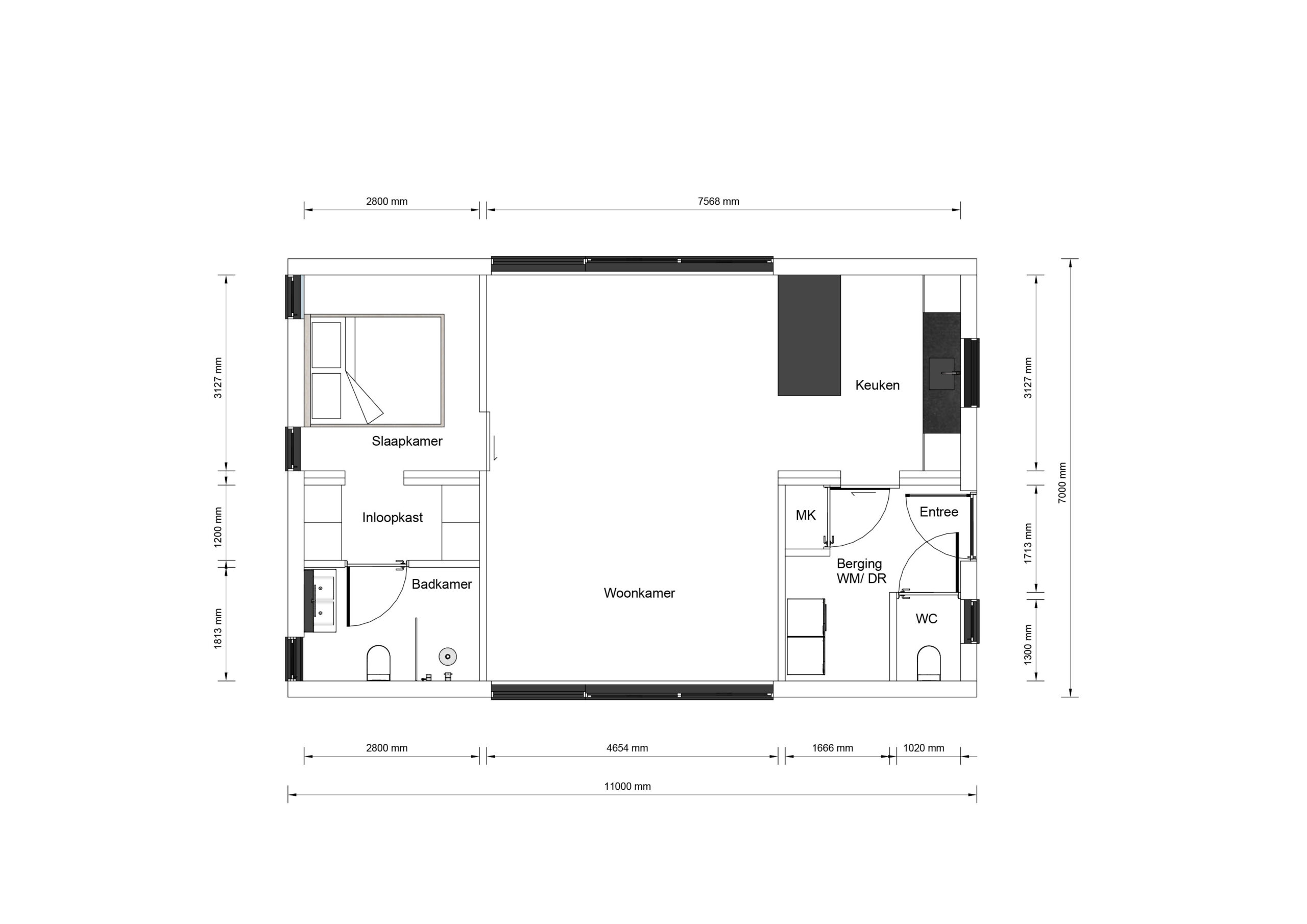 De Bellora is een compacte woning met een warme, overzichtelijke indeling. De slaapkamer is ruim opgezet en grenst aan een inloopkast en een fijne badkamer. De open keuken en ruime woonkamer zorgen samen voor een rustige leefruimte. Met 11 meter lengte is dit model goed inpasbaar, zonder in te leveren op comfort. Ideaal voor één- of tweepersoonsbewoning met oog voor rust en gemak.