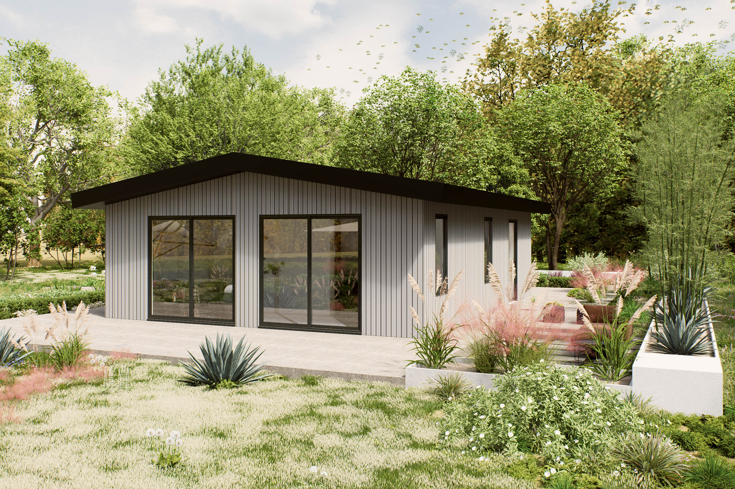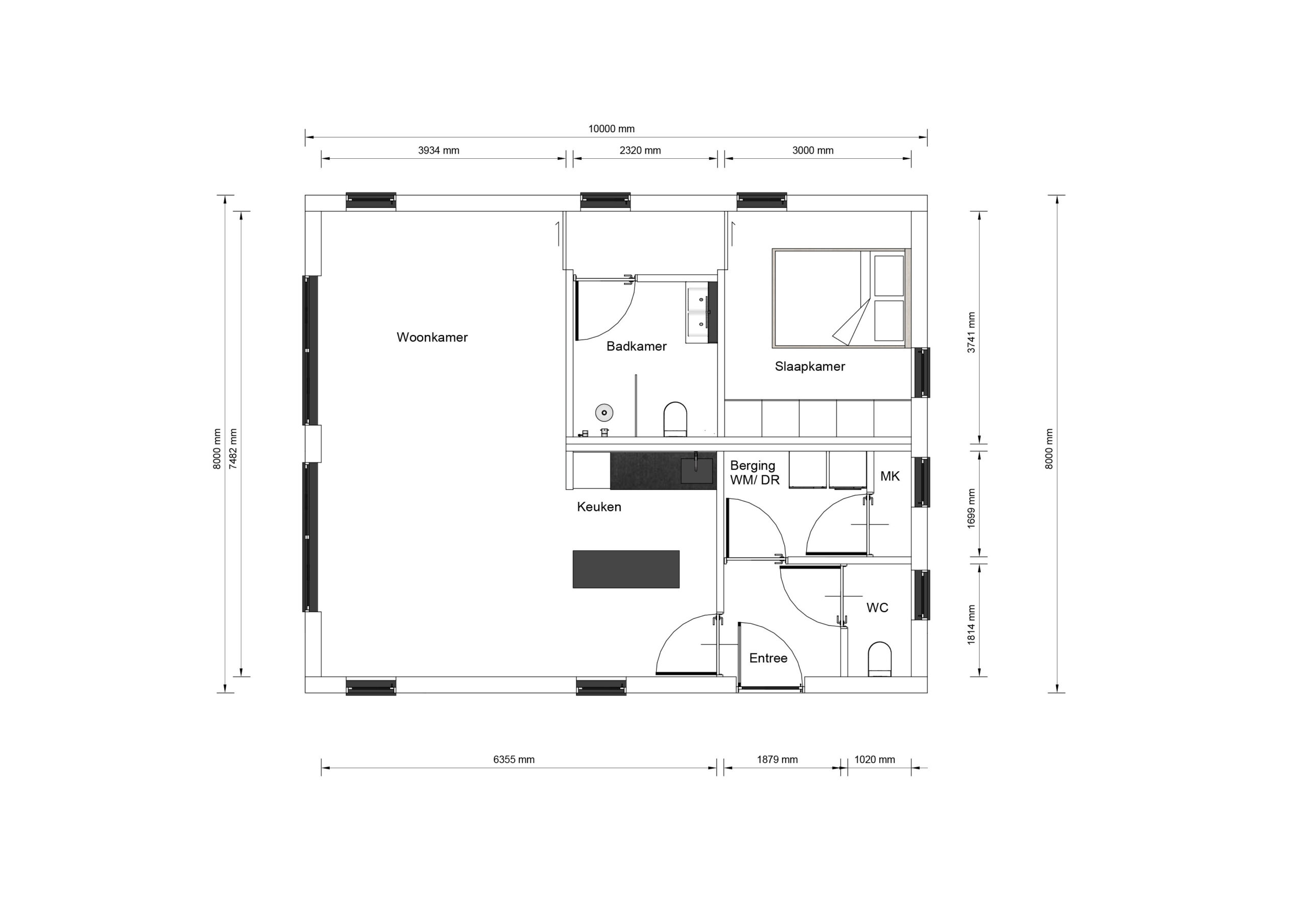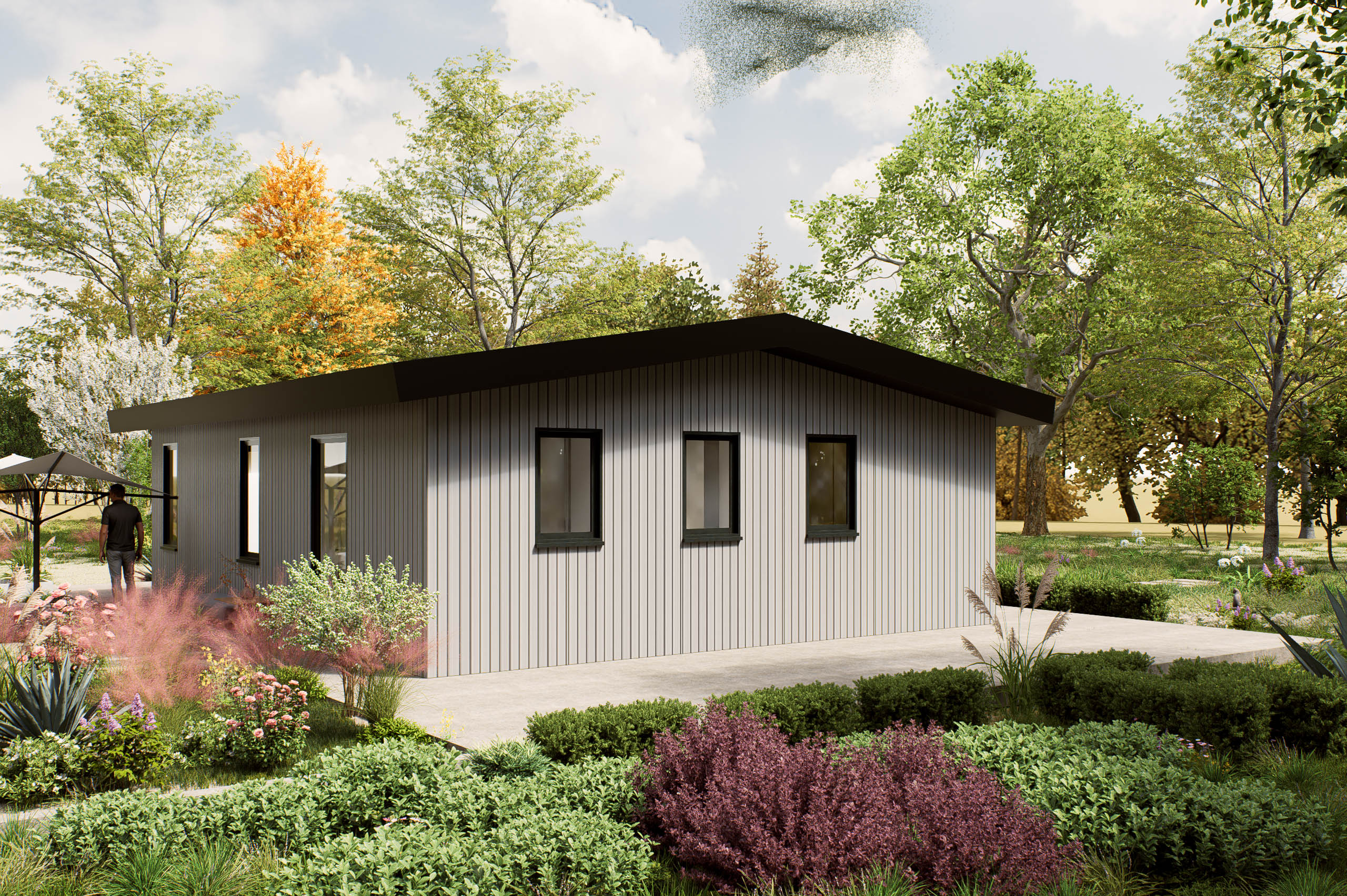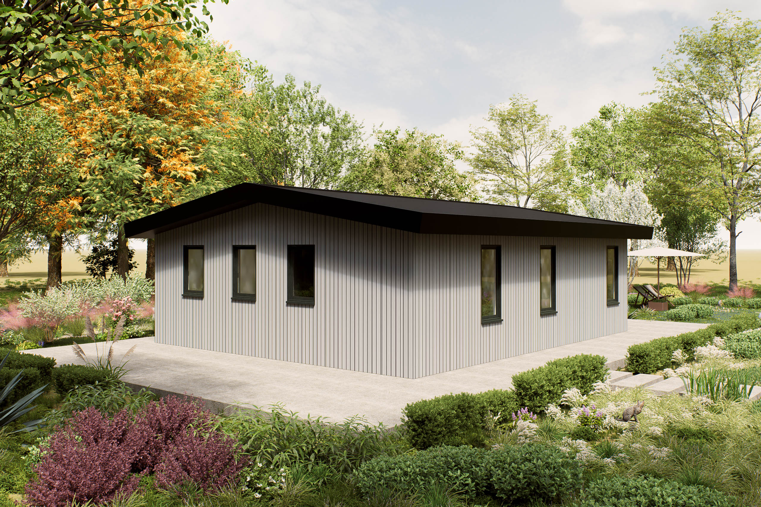 De Ervata is een hoogwaardige prefab woning met een elegant zadeldak, ontworpen voor 1 of 2 personen, ideaal als mantelzorgwoning. Met een afmeting van 10 bij 8 meter biedt deze woning een slimme indeling die comfort en functionaliteit combineert. De ruime slaapkamer en praktische leefruimtes zijn optimaal benut, waardoor er een gevoel van ruimte en lichtinval ontstaat. Het ontwerp straalt moderniteit uit, met een focus op duurzame materialen en een verfijnde afwerking. De plattegrond van de Ervata is bijzonder door de doordachte indeling, die zorgt voor een harmonieuze flow tussen de verschillende ruimtes. Deze woning is perfect voor wie waarde hecht aan kwaliteit en een stijlvolle uitstraling.