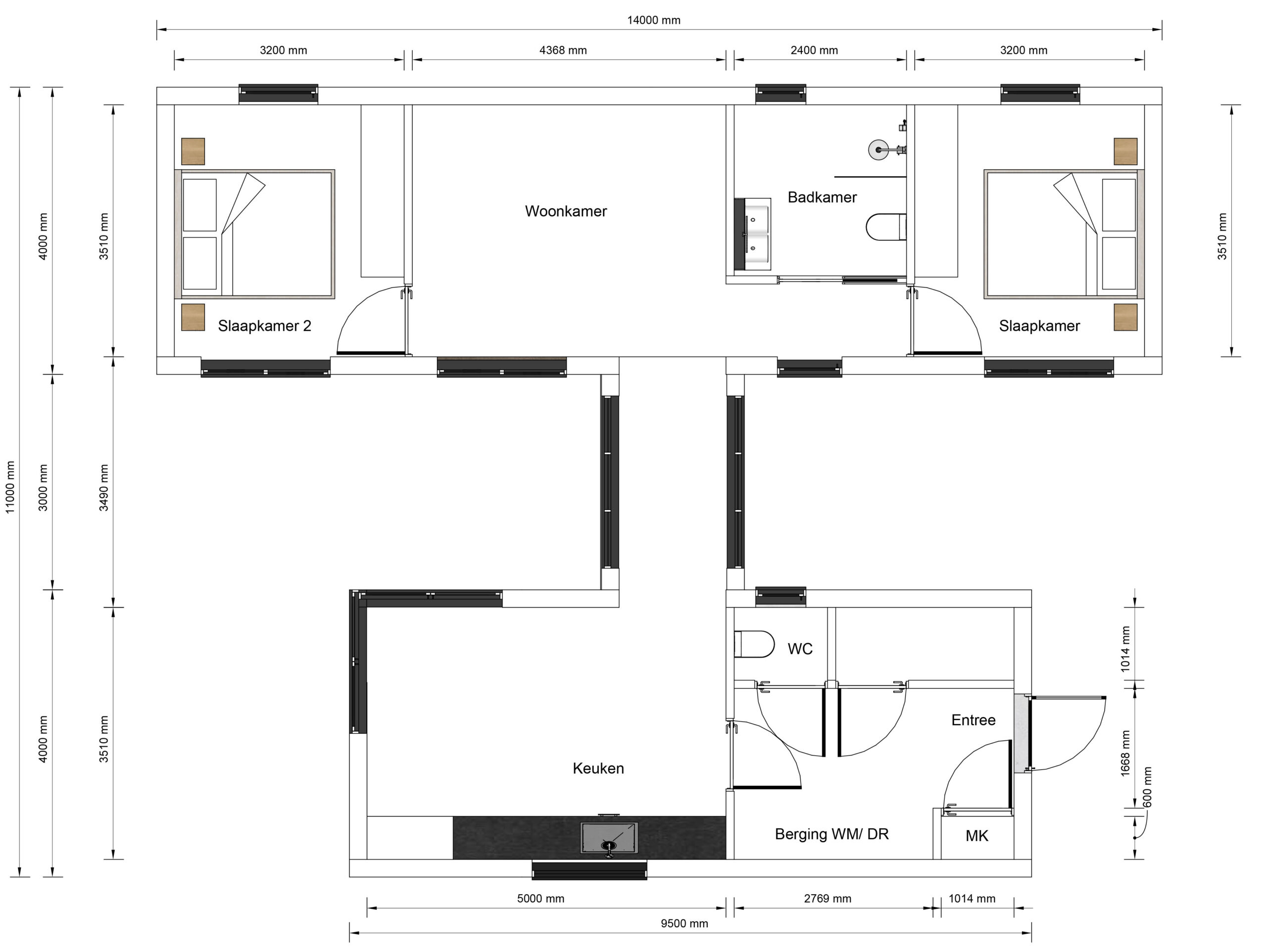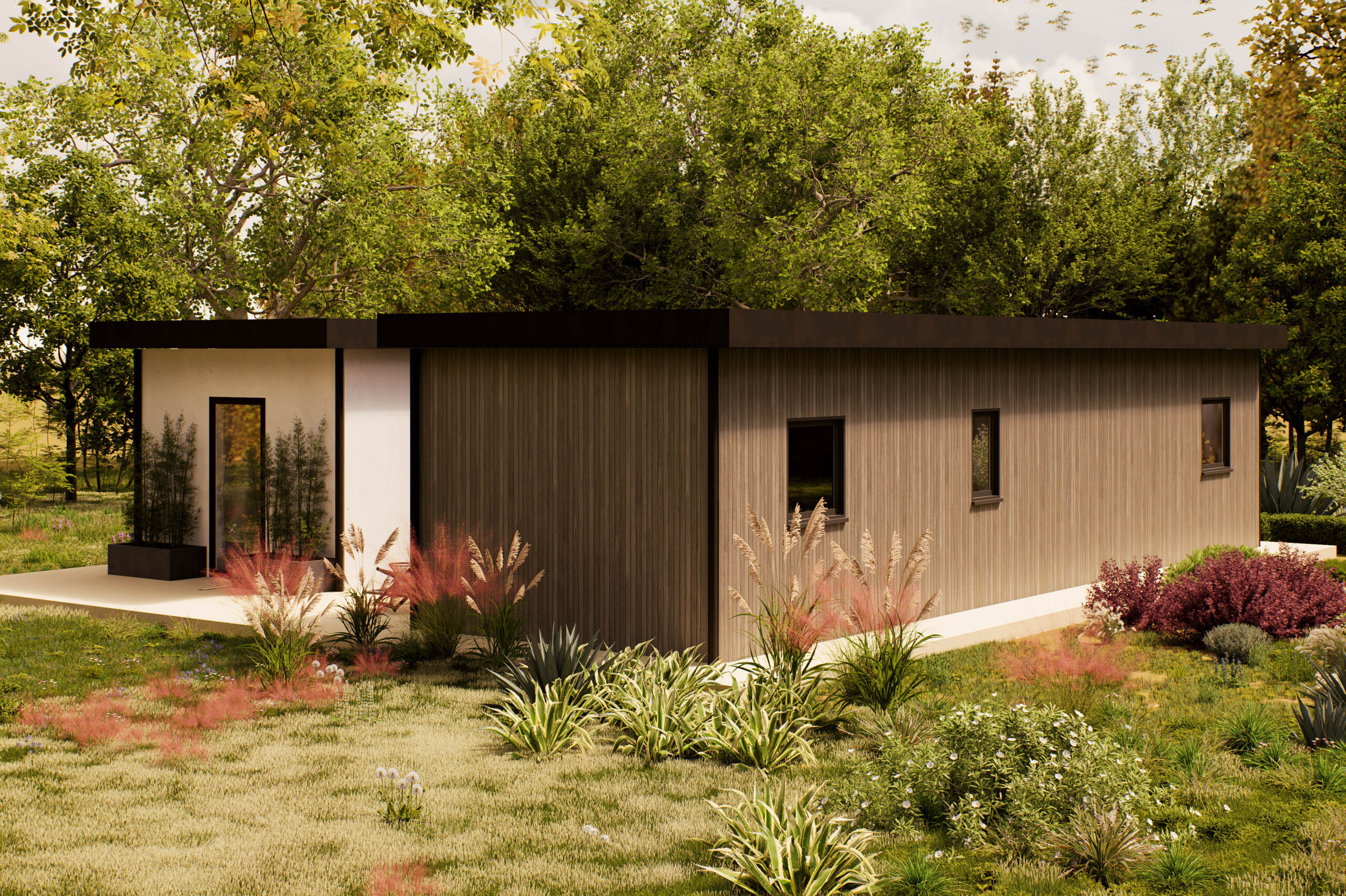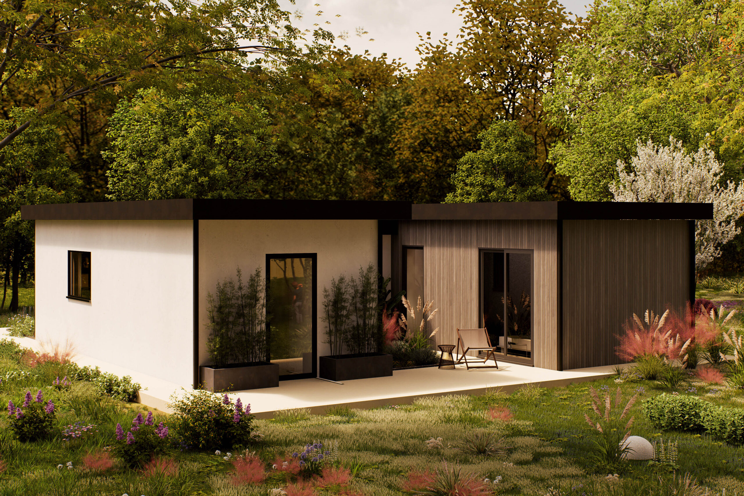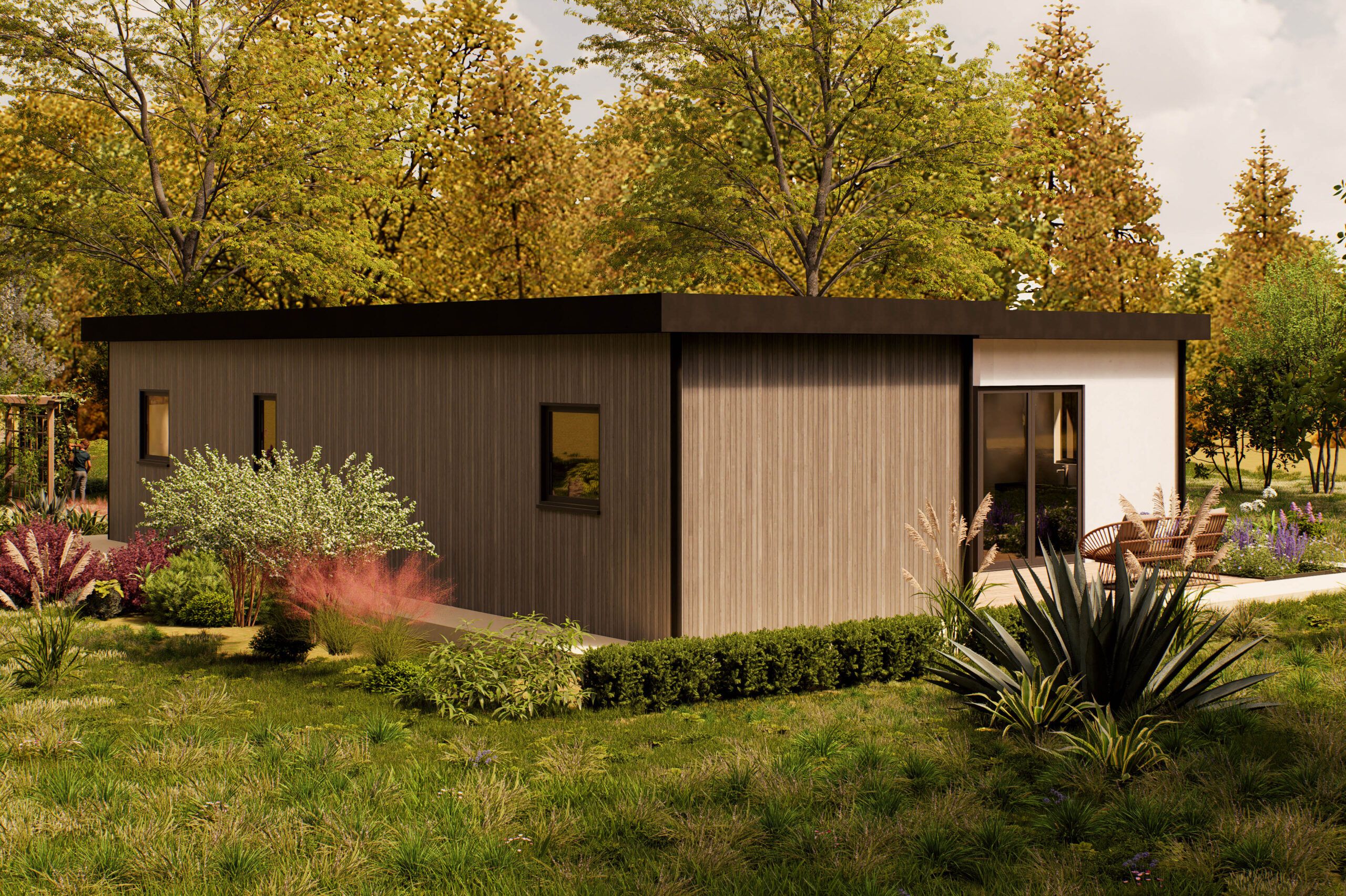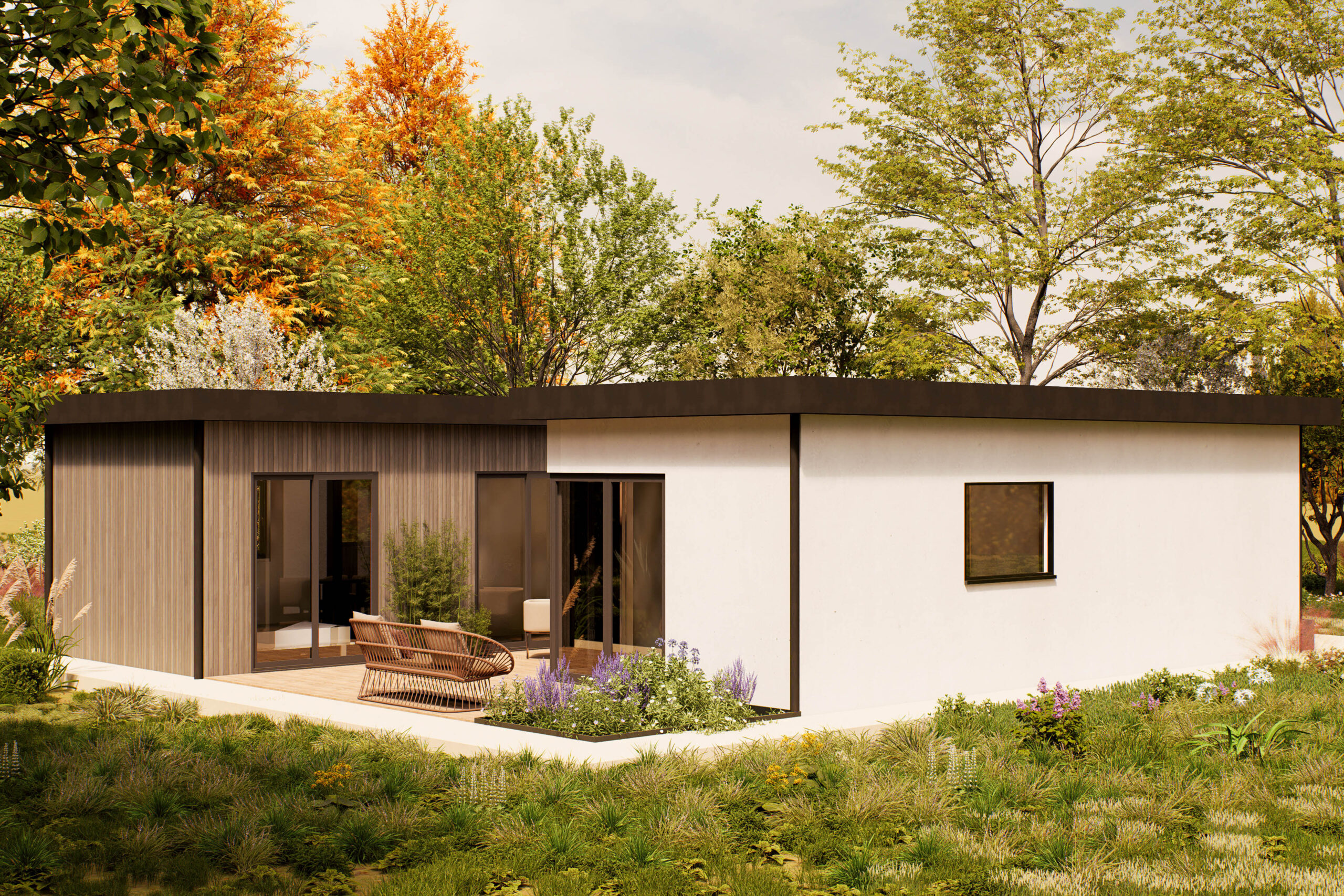 De Gavira is een eigentijdse woning van 100 m², ontworpen voor wie houdt van rust, ruimte en een natuurlijke uitstraling. Het platte dak en de verticale houten gevel geven het model een moderne en warme look, terwijl de grote ramen zorgen voor veel daglicht en een open sfeer. De woning ligt volledig gelijkvloers en is praktisch ingedeeld. Binnen biedt de Gavira twee slaapkamers, een royale woonkamer met open keuken, een los toilet, een berging en een veranda aan de voorzijde. De leefruimte is overzichtelijk en licht, met directe toegang tot het terras en de tuin. De veranda nodigt uit tot buiten zitten, en de berging zorgt voor extra opbergruimte, zodat de woning netjes blijft. De Gavira is geschikt voor uiteenlopende woonvormen: van zelfstandig wonen tot mantelzorg of werken aan huis. Dankzij de heldere plattegrond en het rustige ontwerp is dit model makkelijk aan te passen aan persoonlijke voorkeuren, zoals vaste kastruimte, zonwering of extra voorzieningen. Een woning die rust, stijl en functionaliteit combineert — ideaal voor comfortabel wonen in een groene omgeving.