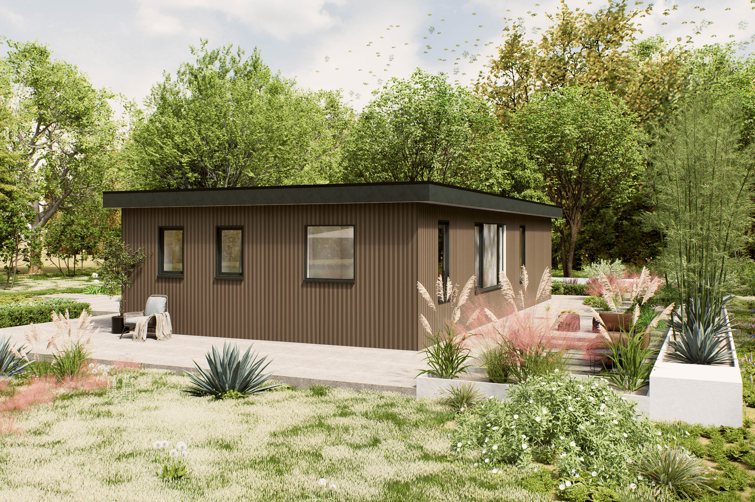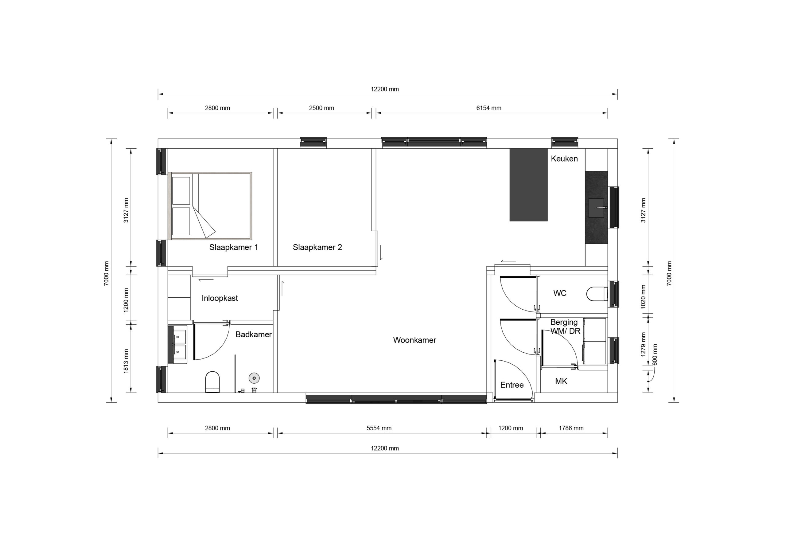 De Navero is een hoogwaardige prefab woning met een elegant zadeldak, perfect voor 1 of 2 personen of als mantelzorgwoning. Met een lengte van 12,2 meter en een breedte van 7 meter biedt deze woning een slimme indeling die optimaal gebruik maakt van de beschikbare ruimte. De twee slaapkamers zijn ontworpen voor comfort en rust, terwijl de grote ramen zorgen voor een overvloed aan natuurlijk licht, wat de leefruimtes uitnodigend en aangenaam maakt. De moderne uitstraling van de Navero, gecombineerd met praktische elementen, maakt het een ideale keuze voor wie waarde hecht aan zowel esthetiek als functionaliteit. De plattegrond is zorgvuldig samengesteld om een gevoel van ruimte te creëren, waardoor de Navero niet alleen een woning is, maar een plek waar men zich echt thuis kan voelen.