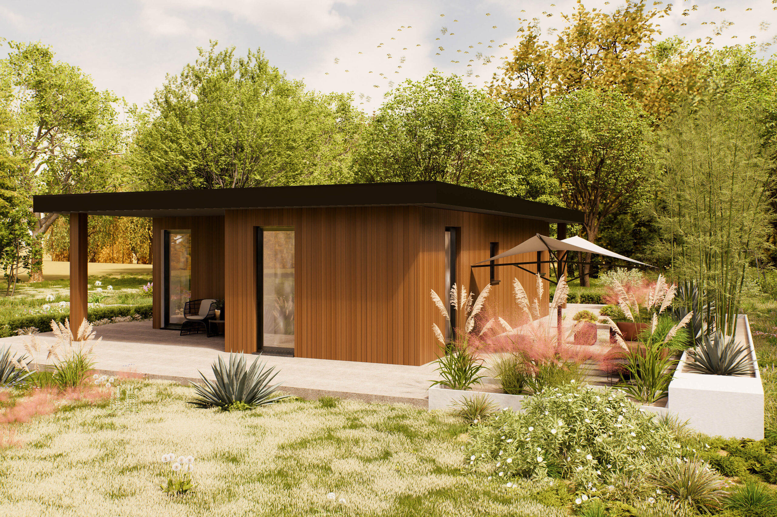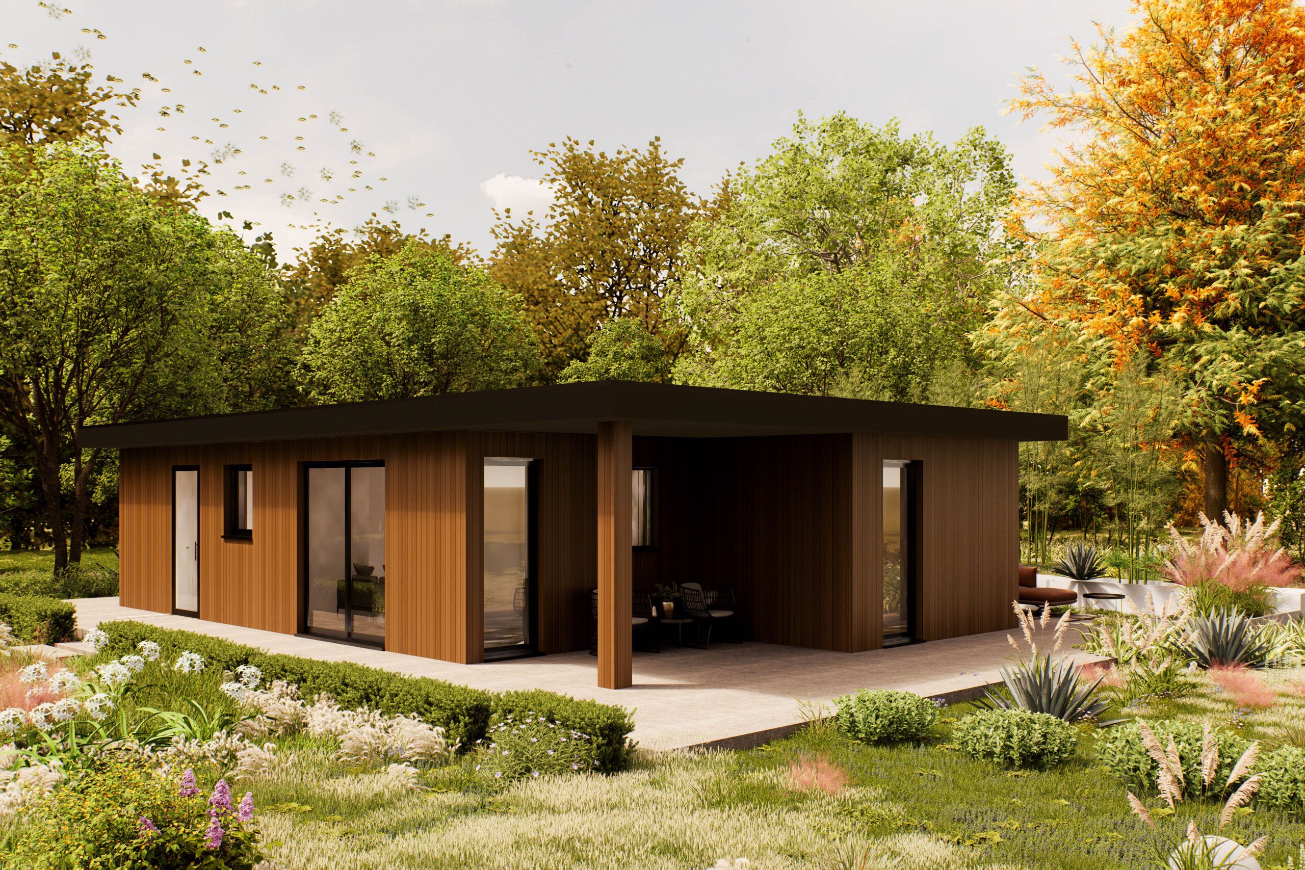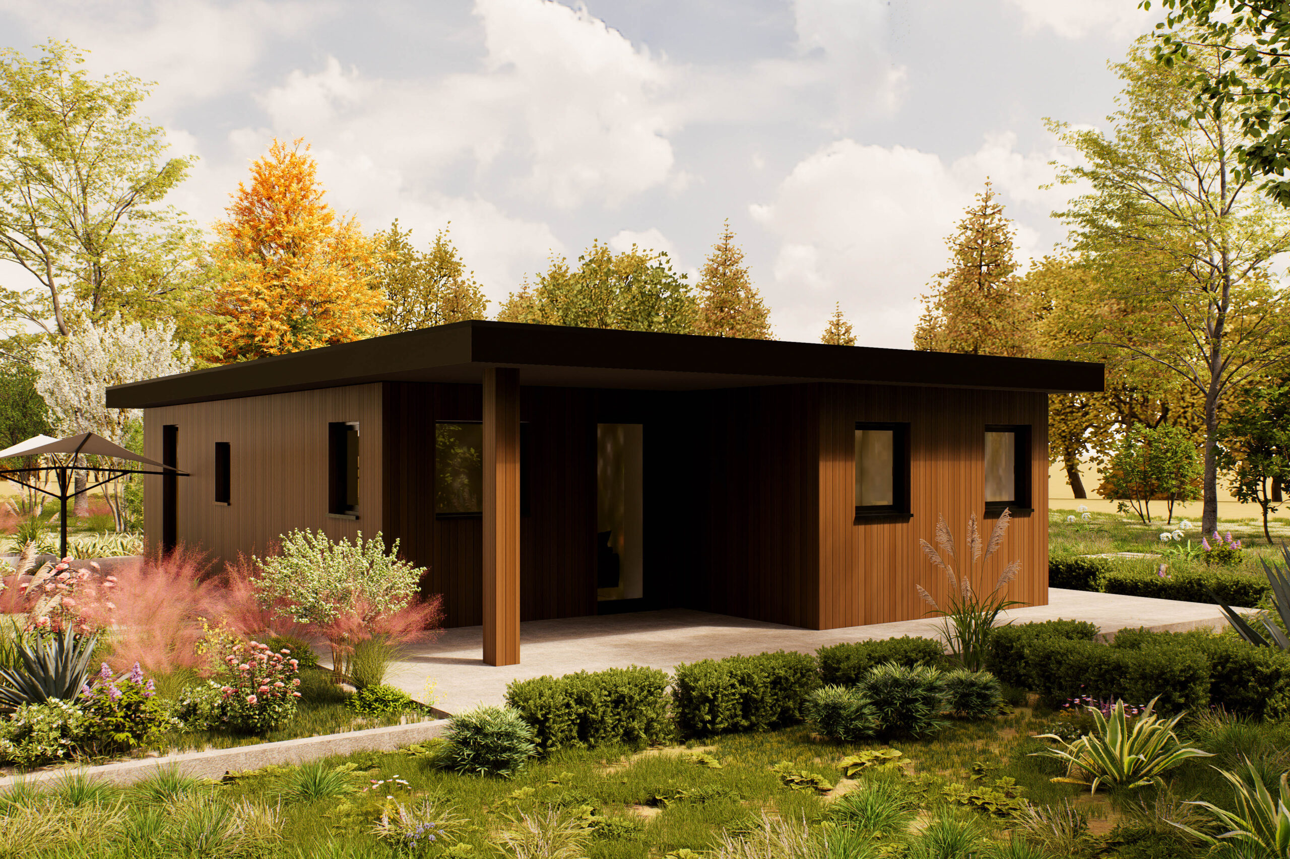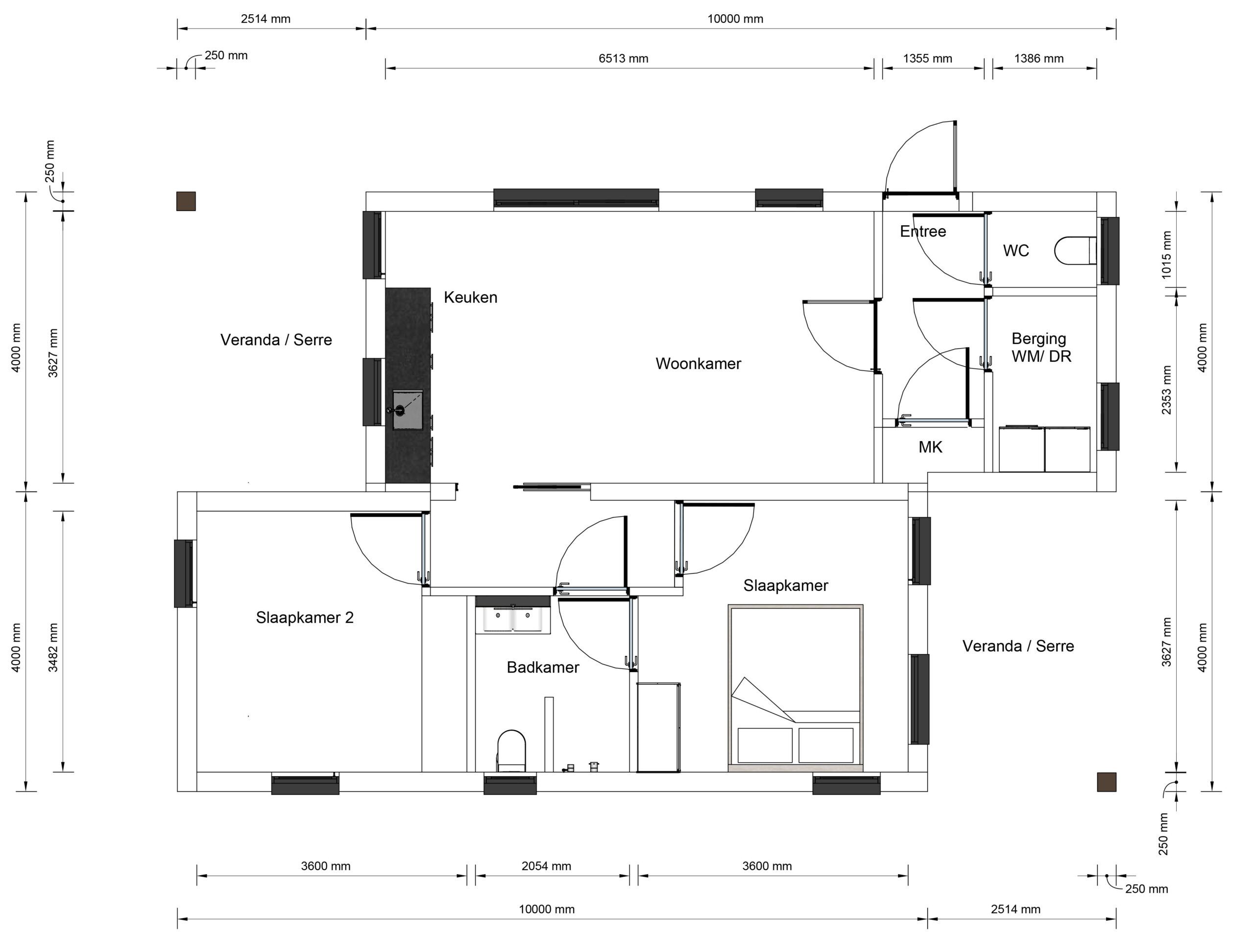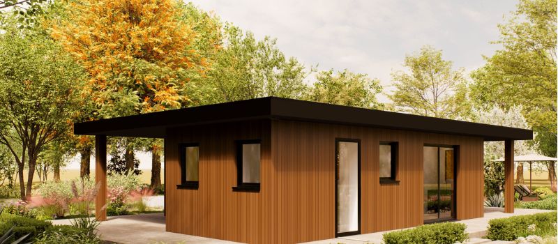 De Rivaro is een eigentijdse woning van 100 m², ontworpen voor wie houdt van rust, ruimte en een natuurlijke uitstraling. Het platte dak en de verticale houten gevel geven het model een moderne en warme look, terwijl de grote ramen zorgen voor veel daglicht en een open sfeer. De woning ligt volledig gelijkvloers en is slim ingedeeld. Binnen biedt de Rivaro twee slaapkamers, een royale woonkamer met open keuken, een los toilet, een berging en een veranda aan de voorzijde. De leefruimte is overzichtelijk en licht, met directe toegang tot het terras en de tuin. De veranda nodigt uit tot buiten zitten, en de berging zorgt voor extra opbergruimte, zodat de woning netjes blijft. De Rivaro is geschikt voor uiteenlopende woonvormen: van zelfstandig wonen tot mantelzorg of werken aan huis. Dankzij de heldere plattegrond en het rustige ontwerp is dit model makkelijk aan te passen aan persoonlijke voorkeuren, zoals vaste kastruimte, zonwering of extra voorzieningen. Een woning die rust, stijl en functionaliteit combineert — ideaal voor comfortabel wonen in een groene omgeving.