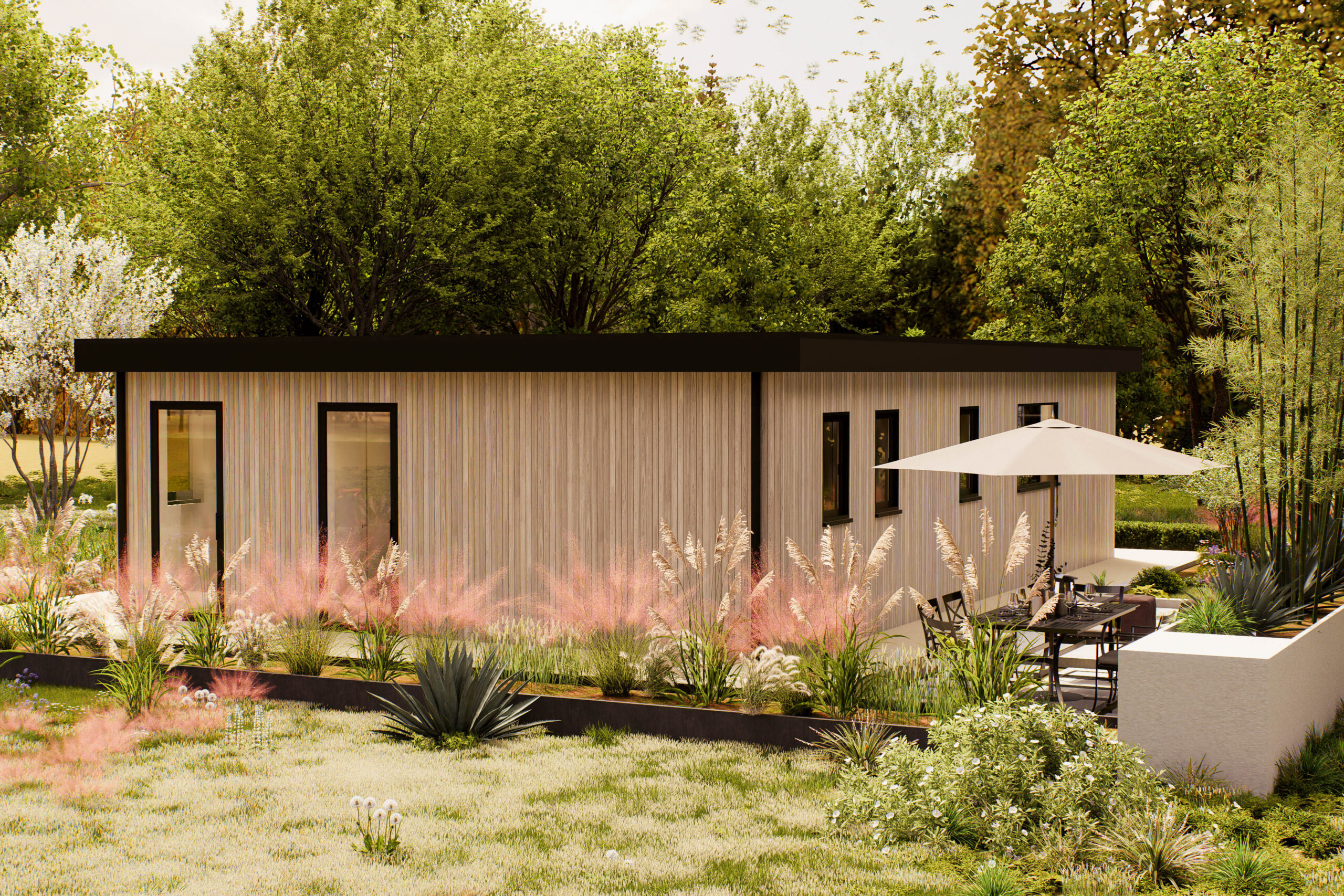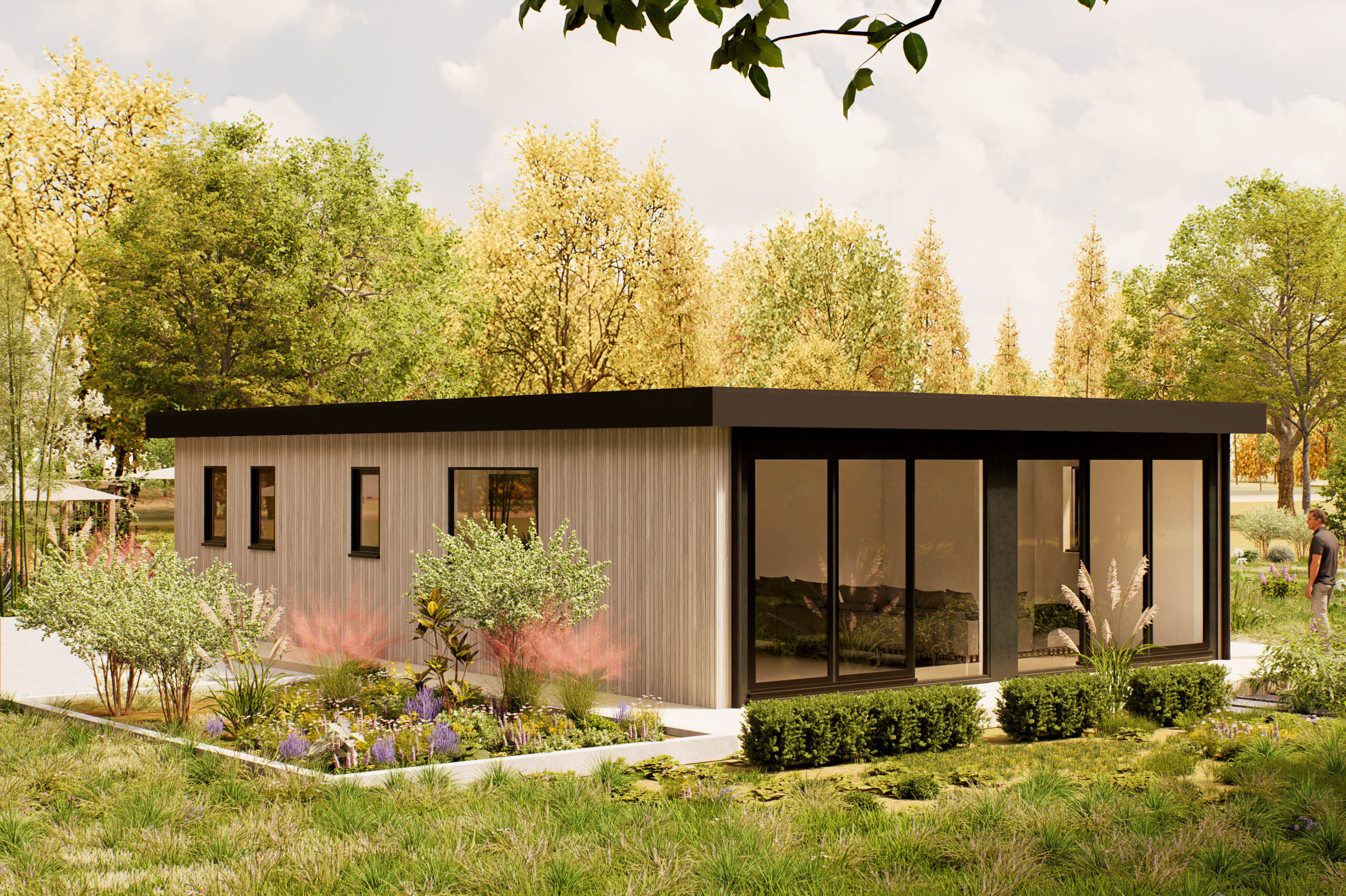 De Verdea is een moderne woning van 100 m² met een rustige uitstraling en een sterke verbinding met het buitenleven. Het platte dak en de houten gevel geven het ontwerp een eigentijdse en natuurlijke look, terwijl de grote ramen en schuifdeuren zorgen voor veel licht en een open sfeer. De woning ligt volledig gelijkvloers en is praktisch ingedeeld. Binnen vind je twee slaapkamers, een royale woonkamer met open keuken, een los toilet, een berging en een veranda aan de voorzijde. De woonkamer biedt voldoende ruimte voor een zithoek en eettafel, met direct zicht op de tuin. De veranda en het terras vormen een fijne overgang naar buiten, perfect voor ontspanning of sociale momenten. De berging zorgt voor extra opbergruimte, zodat de leefruimte overzichtelijk blijft. De Verdea is geschikt voor uiteenlopende woonwensen: van zelfstandig wonen tot mantelzorg of werken aan huis. Dankzij de heldere plattegrond en het rustige ontwerp is dit model makkelijk aan te passen aan persoonlijke voorkeuren, zoals vaste kastruimte, zonwering of extra voorzieningen. Een woning die rust, stijl en flexibiliteit combineert — ideaal voor wie comfortabel wil wonen in harmonie met de omgeving.